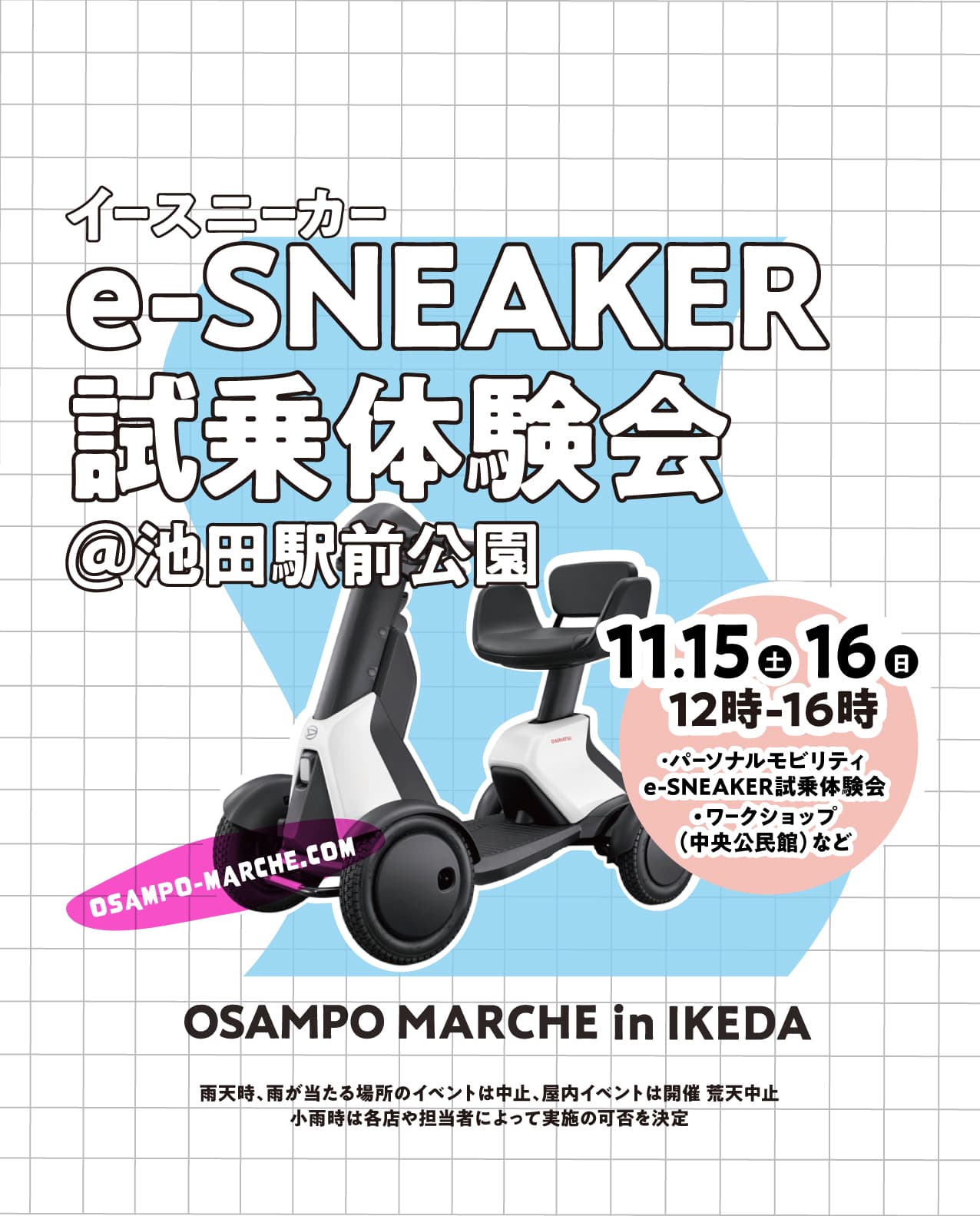 e-SNEAKER試乗体験会| 第5回おさんぽマルシェ in IKEDA 2025 11/14 2025年ニュース 2025年11月14日 最近話題のダイハツが開発した『e-SNEAKER』 免許不要のちいさな車。 歩道を最高速度6km/hで走ることができます。 四輪なので安定性も抜群!ぜひ試乗しに来てね。 この投稿をInstagramで見る エリプラ|いけだエリアプラットホーム(@ikeda_areaplatform)がシェアした投稿 2025年ニュース よかったらシェアしてね! URLをコピーしました! URLをコピーしました! どんぐりマラカスづくり | 第5回おさんぽマルシェ in IKEDA Comove試乗体験会| 第5回おさんぽマルシェ in IKEDA 関連記事 広報からのお知らせ | 第5回おさんぽマルシェ in IKEDA 2025年11月14日 本部からスタートしてね! | 第5回おさんぽマルシェ in IKEDA 2025年11月14日 KUREPAで電気使えるってよ| 第5回おさんぽマルシェ in IKEDA 2025年11月14日 Comove試乗体験会| 第5回おさんぽマルシェ in IKEDA 2025年11月14日 どんぐりマラカスづくり | 第5回おさんぽマルシェ in IKEDA 2025年11月13日 SUBACOわいわい広場 | 第5回おさんぽマルシェ in IKEDA 2025年11月13日 おやこで駅前Debut!| 第5回おさんぽマルシェ in IKEDA 2025年11月13日 KUREPAステージ | 第5回おさんぽマルシェ in IKEDA 2025年11月11日